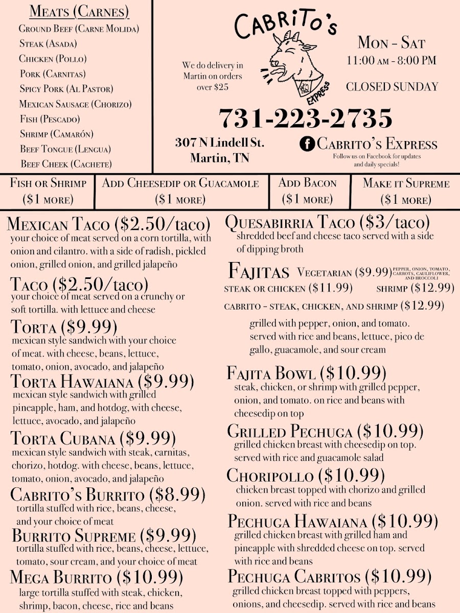 If you’re in the mood for a casual yet delicious bite, Cabrito's Express Menu is the place to be. Located in the heart of Martin, TN, this spot offers a unique twist on classic favorites. From sizzling fajitas to mouthwatering tacos, every dish is made with fresh ingredients, creating the perfect balance of flavors. Whether you're grabbing a quick lunch or enjoying a cozy dinner, there's something for everyone.